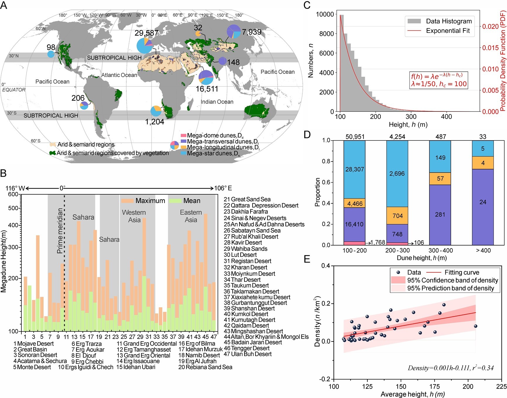 研究發(fā)現(xiàn),全球97%以上高大沙山集中于撒哈拉沙漠與亞洲干旱區(qū),充足沙源與強(qiáng)勁風(fēng)力是沙山發(fā)育的基礎(chǔ)條件;澳大利亞沙漠因植被覆蓋度高、輸沙量有限,而未發(fā)育沙山。全球近91%的沙山高度介于100–200米,且以星狀沙山為主,表明多向風(fēng)況更利于沙山的形成;高度超300米后以橫向沙山為主,超過400米的沙山僅有33座。空間上,大陸內(nèi)部沙丘場(chǎng)沙山平均高度更高且沙山密度隨沙山平均高度升高而顯著增加。