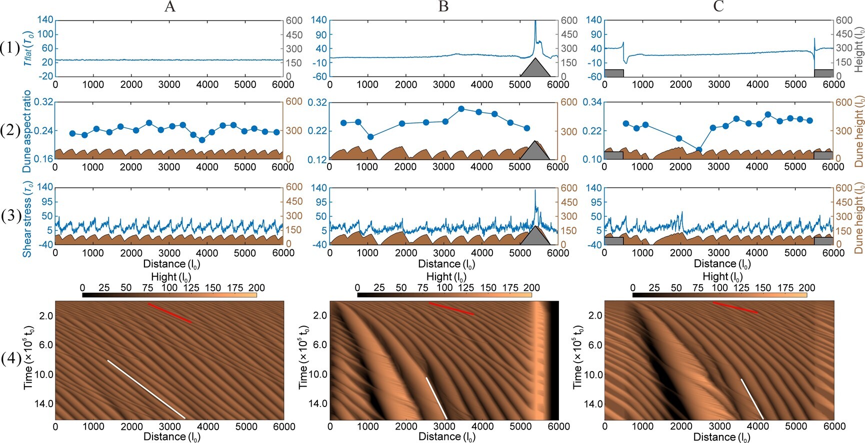 數(shù)值模擬結(jié)果揭示了沙山發(fā)育的核心機(jī)制:平坦地形下沙物質(zhì)均勻分配,抑制高大沙山發(fā)育;山體、盆地等正負(fù)地形引發(fā)剪切應(yīng)力突變,增強(qiáng)沙通量匯聚與沙丘碰撞融合,加速沙丘“粗化”長高。地形通過持續(xù)塑造風(fēng)場(chǎng)與沙源空間異質(zhì)性,成為高大沙山形成的關(guān)鍵動(dòng)力。